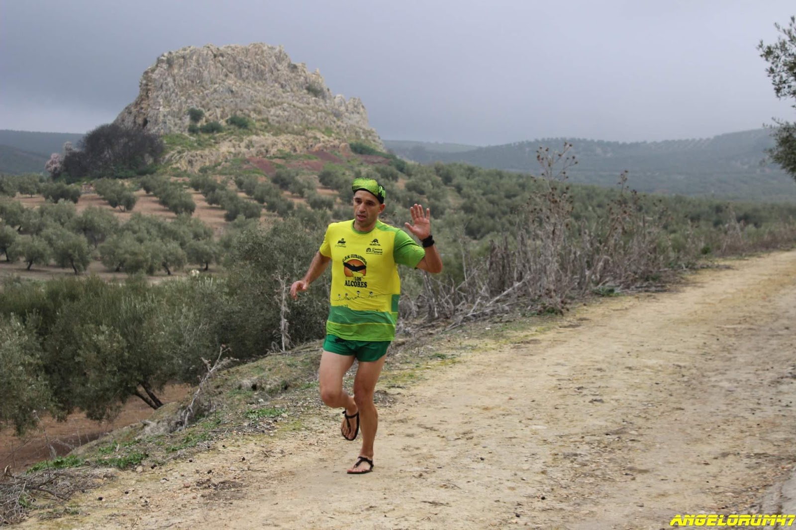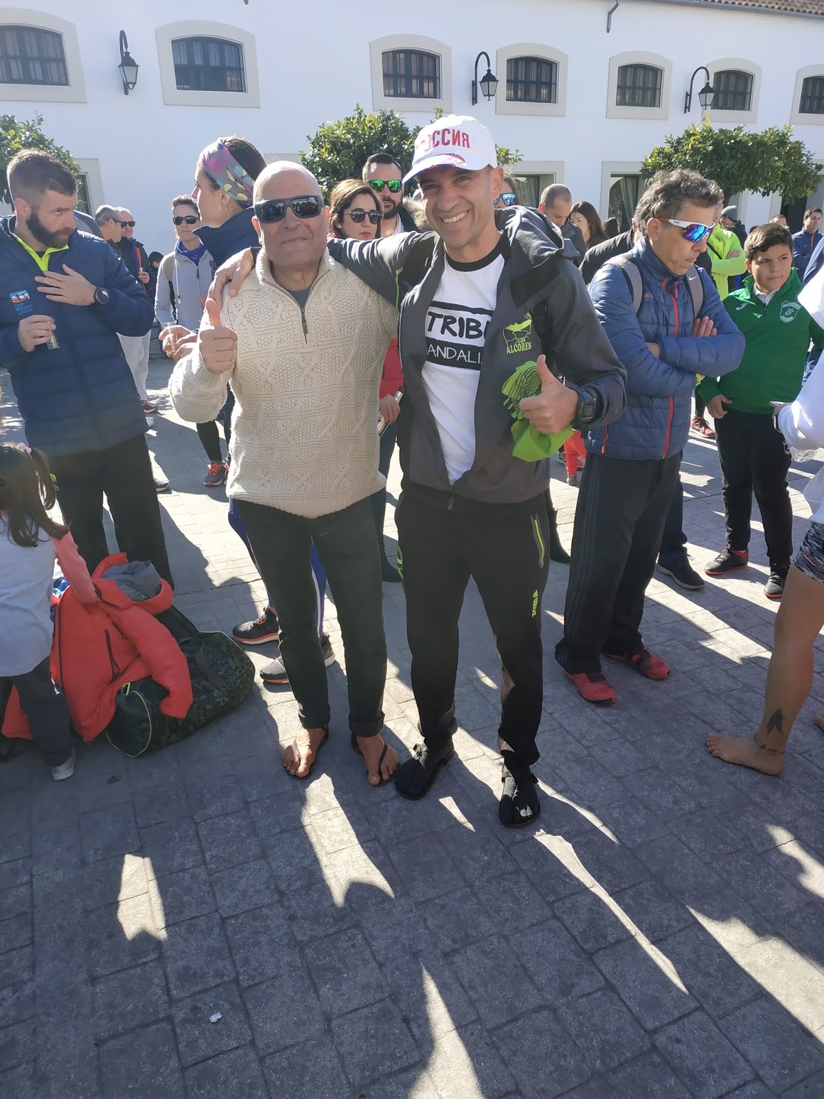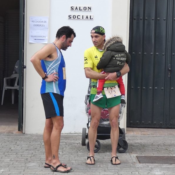 Ya el Domingo, me levanto a las 8.00 voy al lugar de salida donde se recogía los dorsales y desayuno en uno de los pocos bares que había abierto a esa hora. Vuelvo al Hostal, me coloco mi camiseta de Club, mis calzonas y sobre todo hago elección de neumáticos… En este caso, elijo las Tribu Urban… Sandalias de tan solo 6mm de grosor, pero con las que me siento súper cómodo y ligero cada vez que me las pongo. Sé que al ser un Cross, encontraría piedras, que iba a notar en mis pies con este grosor de sandalias , pero si había muchísimos valientes, para mí súper héroes, que iban a correr descalzos, no tenía que ser un impedimento esos 6mm 😉 y nos fuimos directos al punto de salida!!!.
